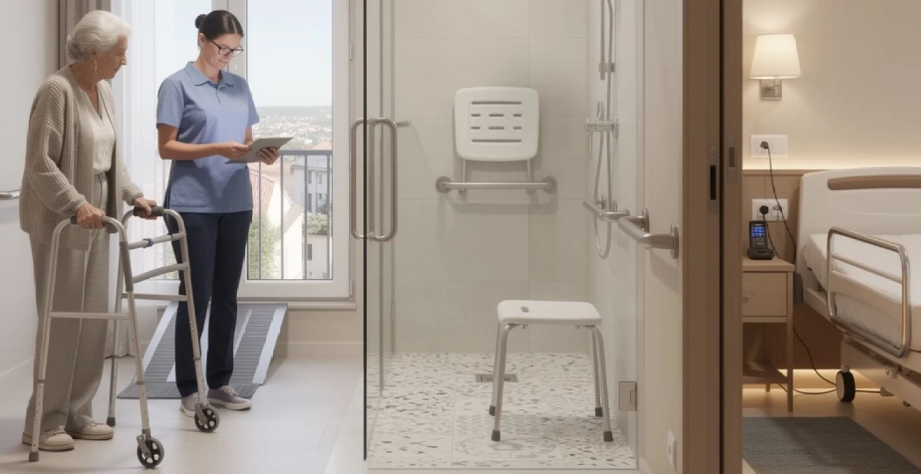Concrètement, cela passe par l’élargissement des passages, la suppression des ressauts et marches inutiles, l’installation de rampes d’accès et la mise à hauteur ergonomique des commandes (prises, interrupteurs, poignées). L’objectif est que vous puissiez vous déplacer avec votre aide technique (canne, déambulateur, fauteuil roulant) sans devoir vous contorsionner ni demander systématiquement l’aide d’un proche. Ces aménagements améliorent aussi la sécurité des intervenants à domicile (aides à domicile, infirmiers, kinésithérapeutes) lors des transferts et des soins.